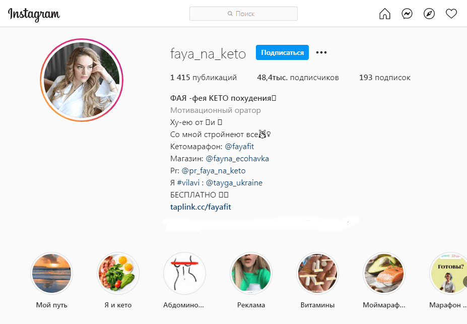 На девушку подписано практически 50 тысяч человек. Она в своем блоге рассказывает про свою жизнь, правильное питание и спорт. У нее также есть страница с марафоном по похудению которая насчитывает 10 тысяч подписчиков и свой инстаграм магазин с эко продуктами.
