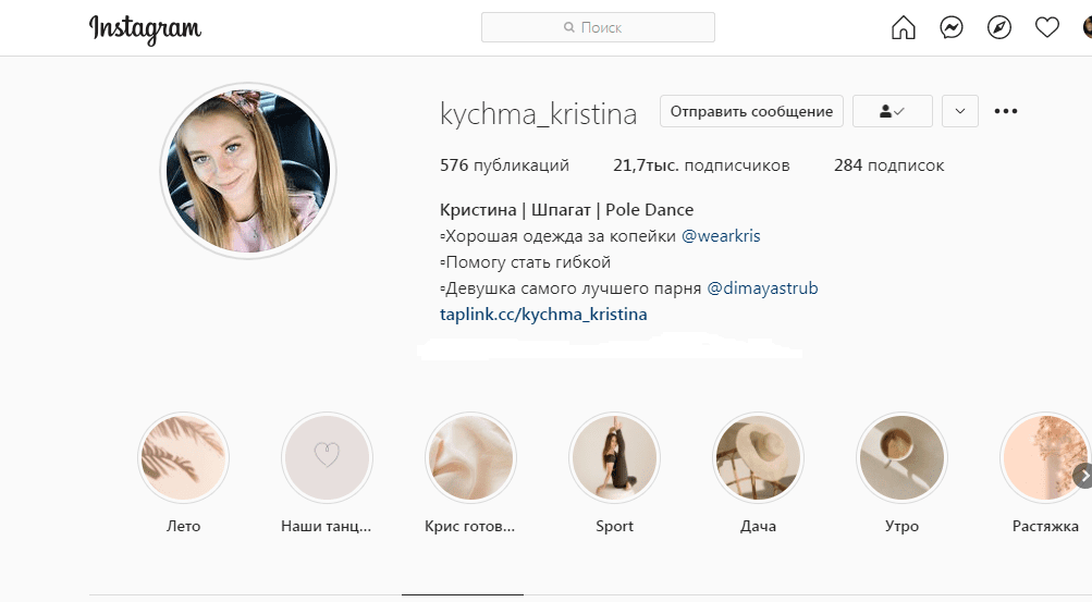 На страницу девушки подписано больше 20 тысяч подписчиков. Она рассказывает про свою жизнь,семью и путешествия. Заниматься Pole Dance и проводит занятия по растяжке. Занимался перепродажей одежды в инстаграме и воспитанием дочки.